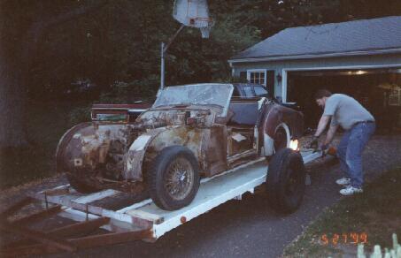 Henry Frye (shown here tying the 1960 TR3 to the trailer with appropriately vintage coat-hangers) came over to unload a pickup truck full of Spitfire parts on Andy, but ended up with a pickup truck full of TR3 body panels to take home instead!